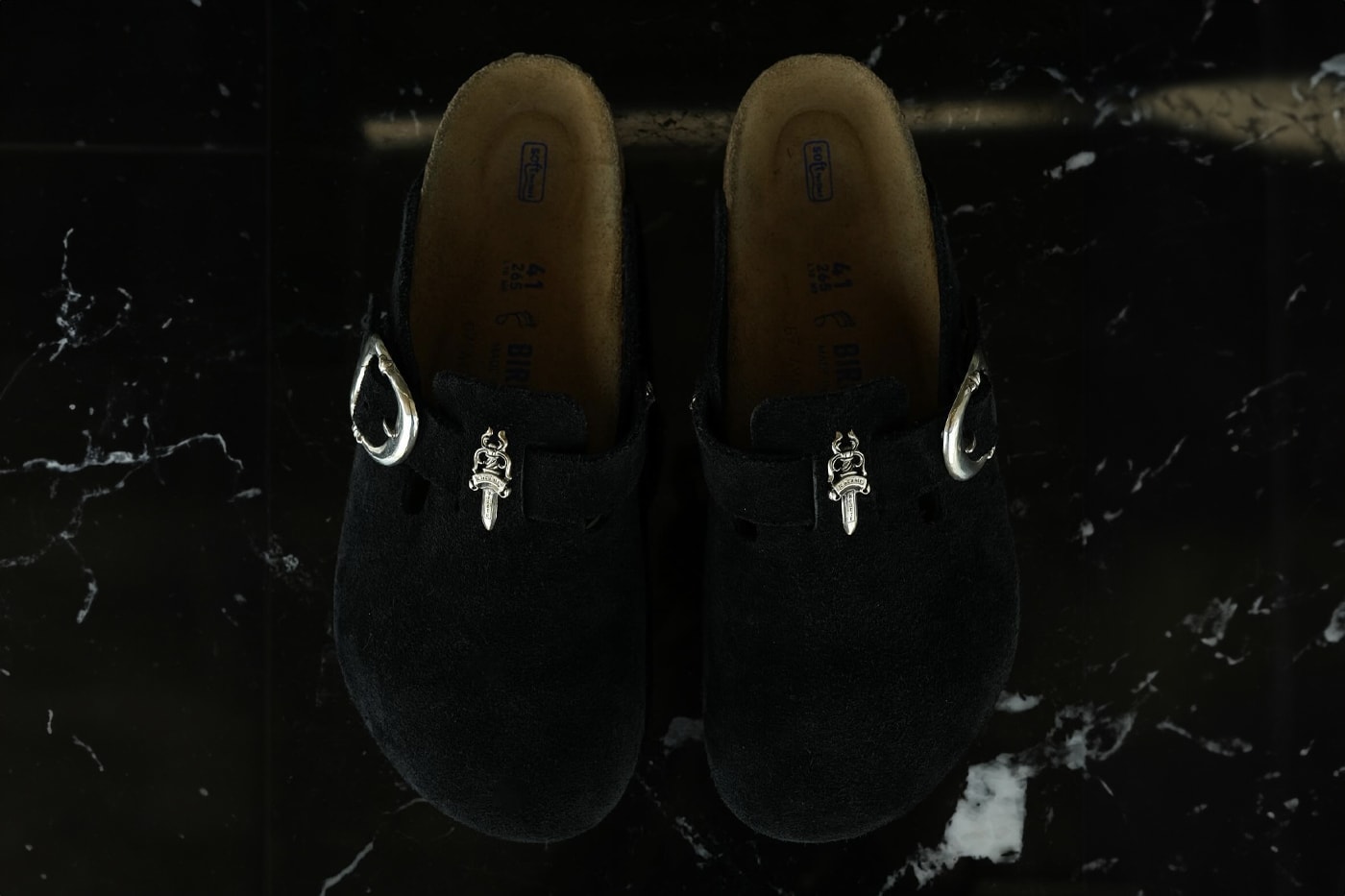 Чорна та коричнева замша. Простий силует Boston, який знають навіть ті, хто гадки не має, хто такий Карл Лагерфельд. Але далі – магія. На ремінцях сяють срібні кинджали та хрести — символіка Chrome Hearts, яку ти дізнаєшся з першого погляду, навіть якщо зараз читаєш це у спортзалі, а не в галереї.