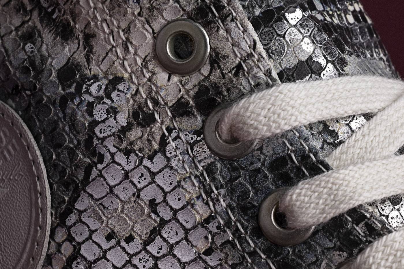 Все починається з форми, яку ми знаємо з дитинства – високий силует, гумова підошва, культовий логотип All Star на щиколотці. Але тепер на звичний «канвас» нанесено розкішний шар: