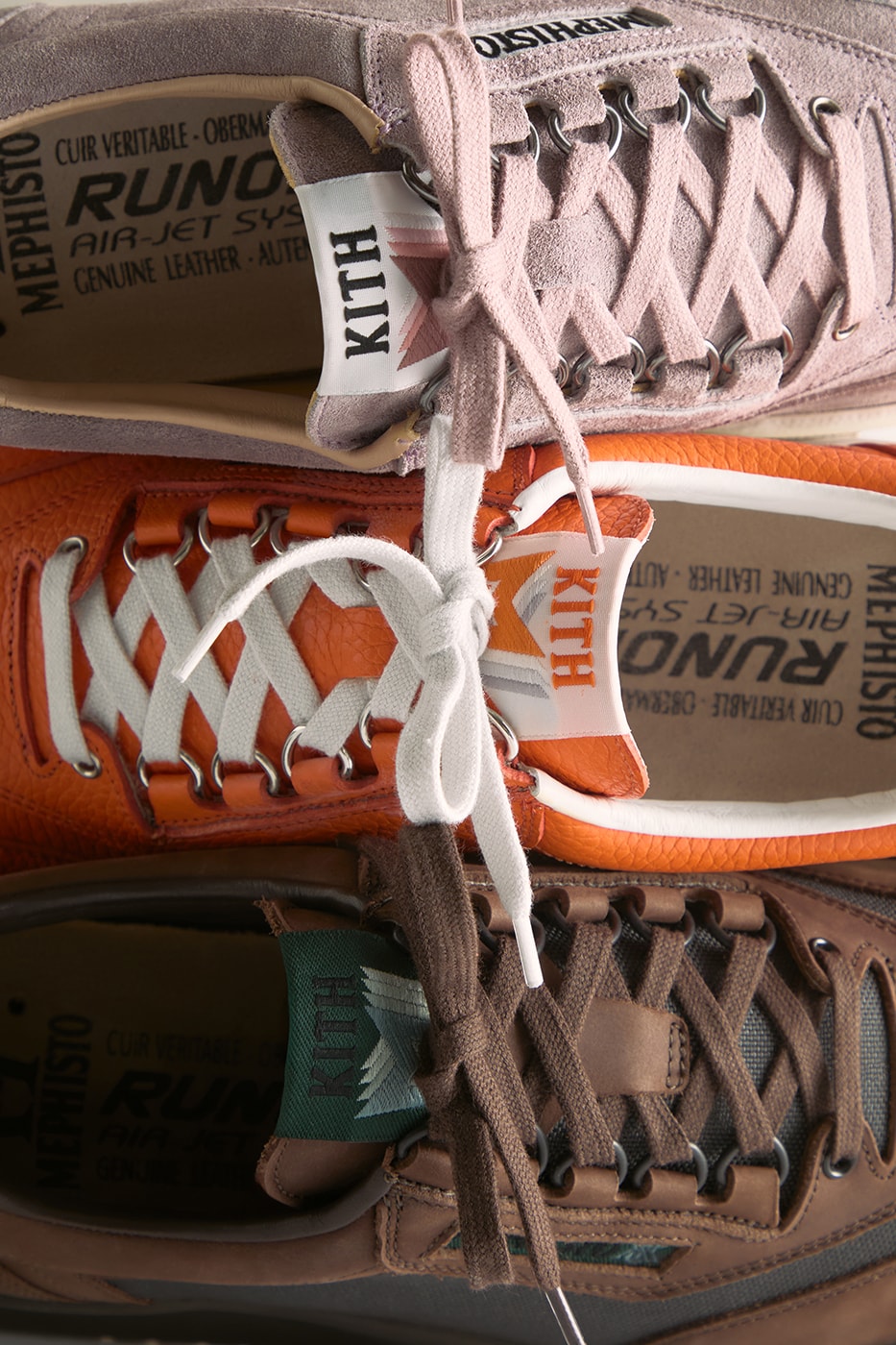 Металеві люверси, фірмова брендингова вставка Kith мовою кросівка та бічна панель з co-branding'ом роблять взуття унікальним. А легендарна французька підошва Mephisto гарантує комфорт та довговічність, які не підведуть навіть за активного міського життя.