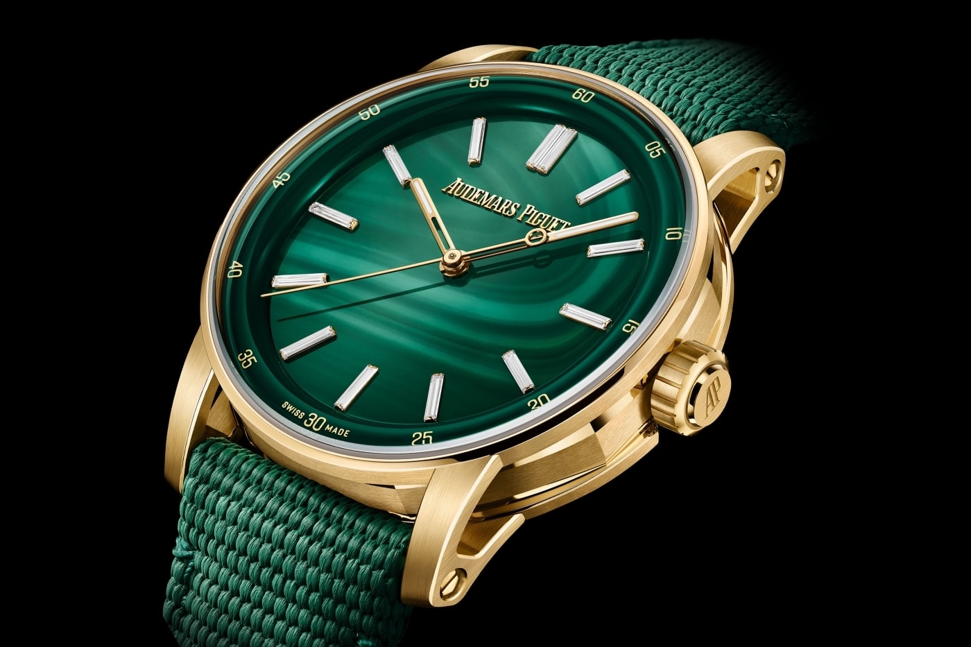- Малахітовий циферблат у корпусі з жовтого золота - глибокий зелений відтінок і характерна смугаста текстура каменю створюють враження руху всередині статичної форми.