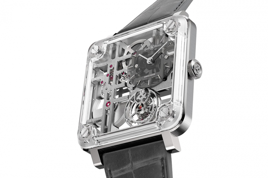 BR-X3 ламає звичні рамки бренду, уникаючи авіаційних інструментів до високої годинної культури. Корпус — квадратний, виконаний зі сталі та сапфіру — немов вітрина для внутрішнього світу годинника: прозорий, строгий, мінімалістичний. Погляд ковзає скелетонізованим механізмом, де лінії і сітка нагадують геометричну абстракцію Піта Мондріана і функціональну чистоту Шарлотти Перріанд. 26 рубінів додають яскраві акценти, а поліровані кромки та сатиновані мости підкреслюють майстерність оздоблення.
