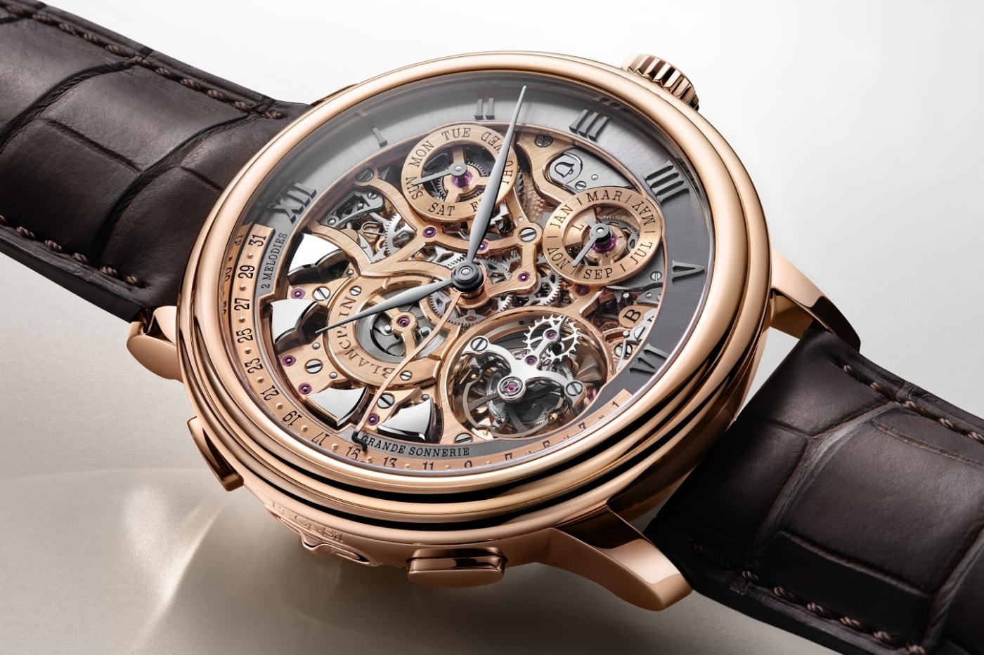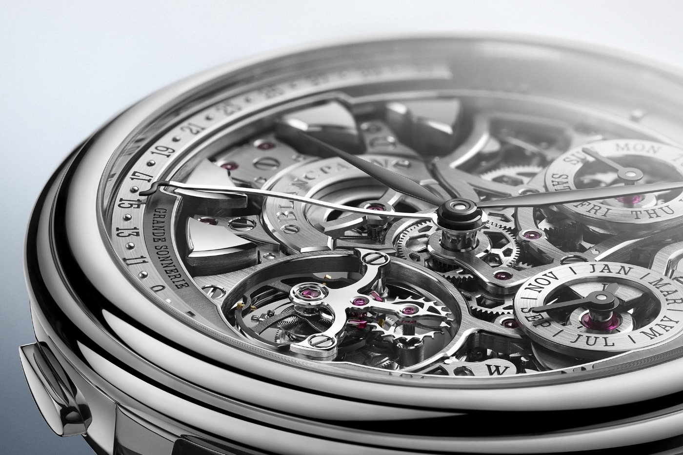 Grande Double Sonnerie – це не тільки музика. Тут grande sonnerie, petite sonnerie, minute repeater, турбійон, що летить, і ретроградний вічний календар з'єднані в одному корпусі. Всі деталі, включаючи 26 мостів і платину з 18-каратного золота, виконані вручну: англаж, перляж і дзеркальне полірування роблять годинник справжнім витвором мистецтва.