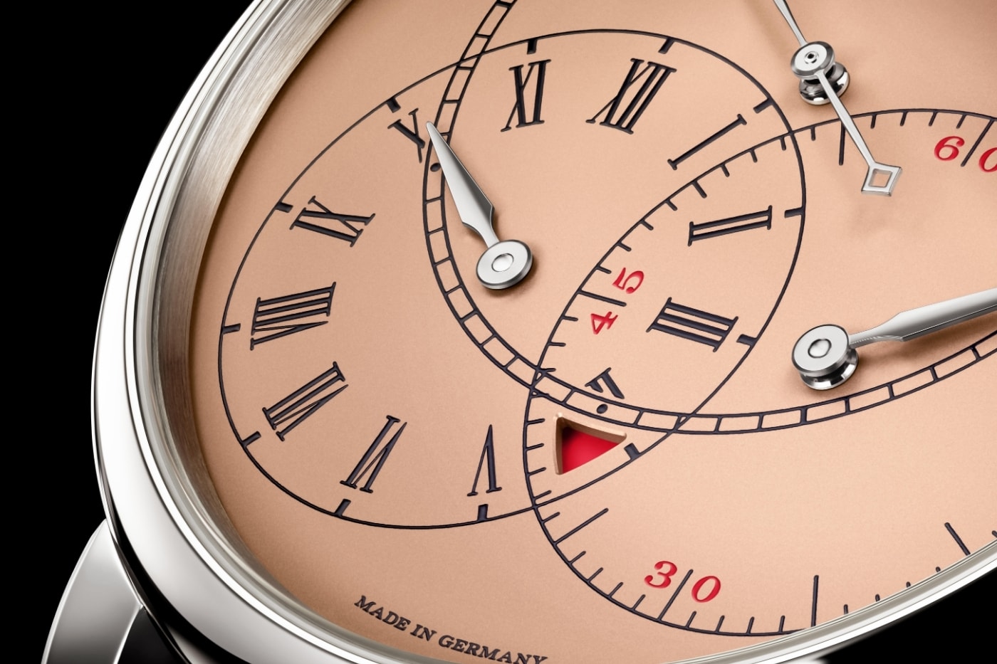 За дев'ять років цей шедевр повертається. Корпус 39,9 мм із білого золота приховує циферблат із рожевого золота, де час читається по трьох концентричних колах — годинник, хвилина і та сама секундна стрілка, яка робить ідеальні «стрибки» кожну секунду.