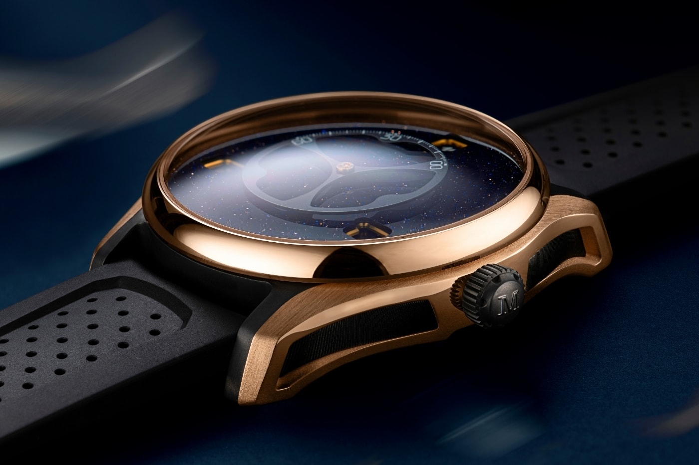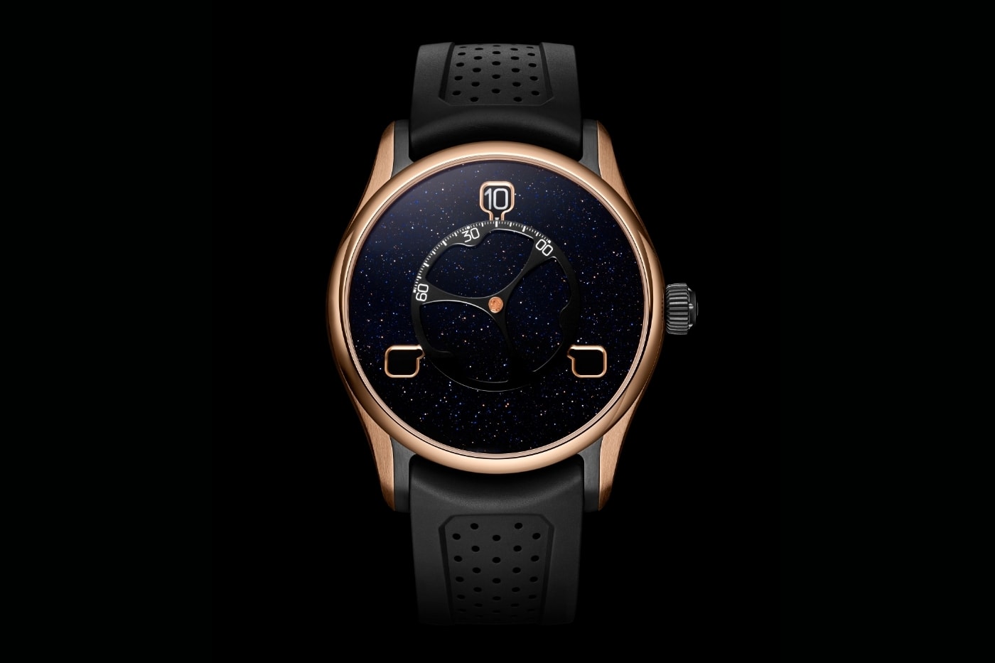 Червоне золото 5N з авантюрином — це космічне небо на вашому зап'ясті, лімітована серія всього 100 екземплярів по $49,900. Чорний DLC-титановий акцент додає брутальності, а чорний каучуковий ремінь робить образ завершеним.
