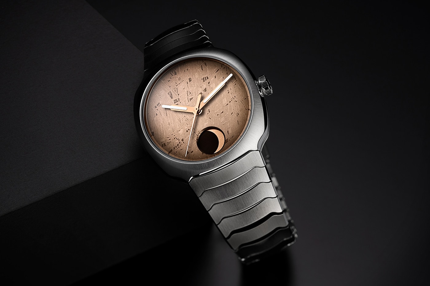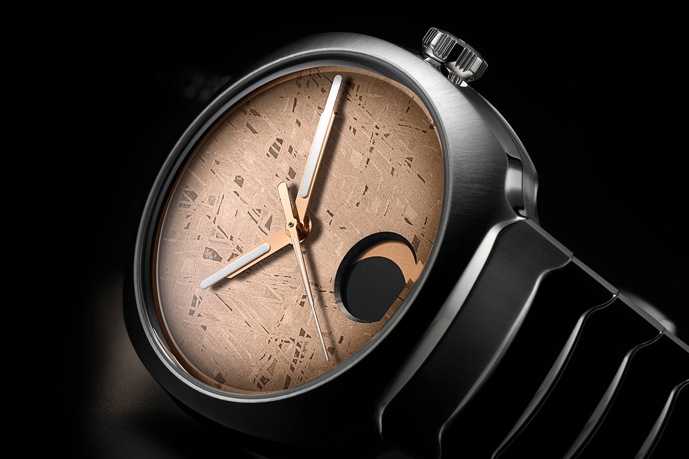 Головна особливість моделі — циферблат із метеориту Гібеон, який мільйони років борознив простори космосу, перш ніж приземлитися в Намібії. При точній обробці він розкриває унікальний візерунок Відманштеттена, кристалічну структуру залізо-нікелевих сплавів, яку неможливо повторити штучно. М'який золотистий тон і фірмовий ефект fumé перетворюють кожен циферблат на ексклюзивний фрагмент космосу - справжній шматочок Всесвіту на вашому зап'ясті.