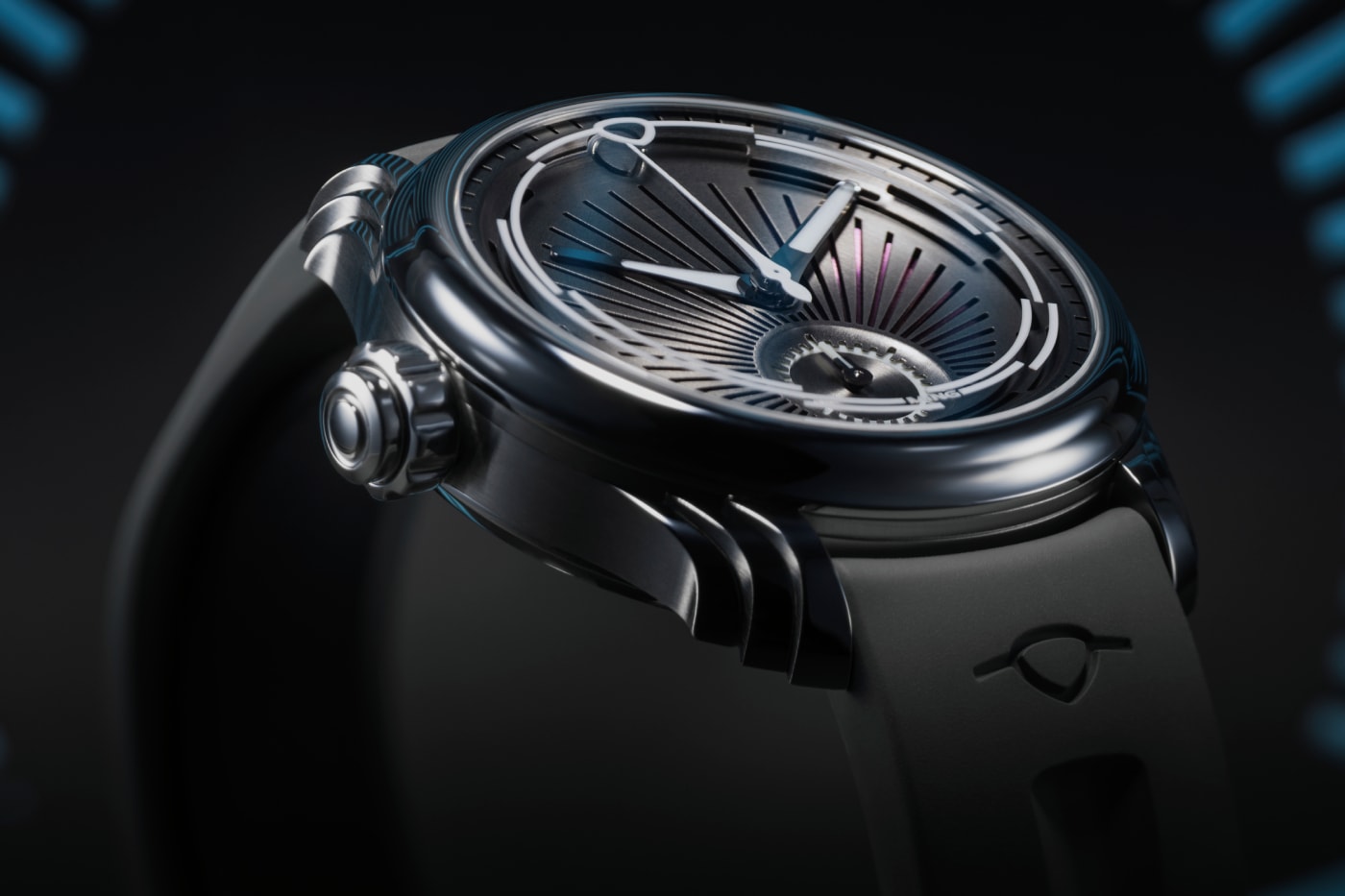 Глибоко увігнутий циферблат з радіальними вирізами розкриває багатошарову основу, що змінює колір і відбиває світло.