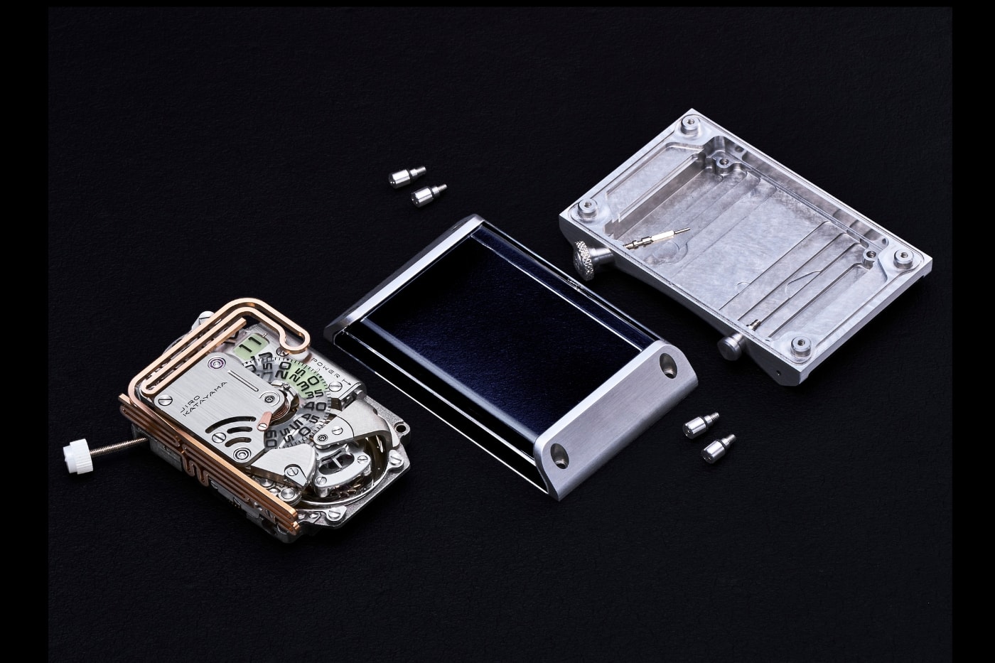Прямокутний корпус розміром 48×30 мм із нержавіючої сталі нагадує приладовий модуль космічного корабля. На правій стороні циферблата — диски годин і хвилин з підсвічуванням, яке пожвавлює механізм у темряві. Ззаду — вигнута сталева кришка та ремінець із телячої шкіри шириною 26 мм. Все розраховано так, щоб годинник сидів зручно, незважаючи на їх значні розміри.