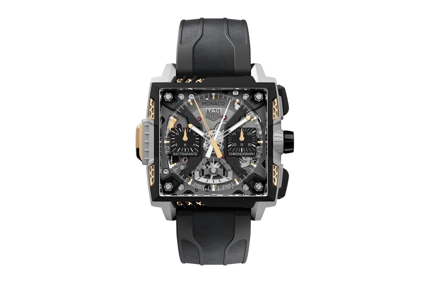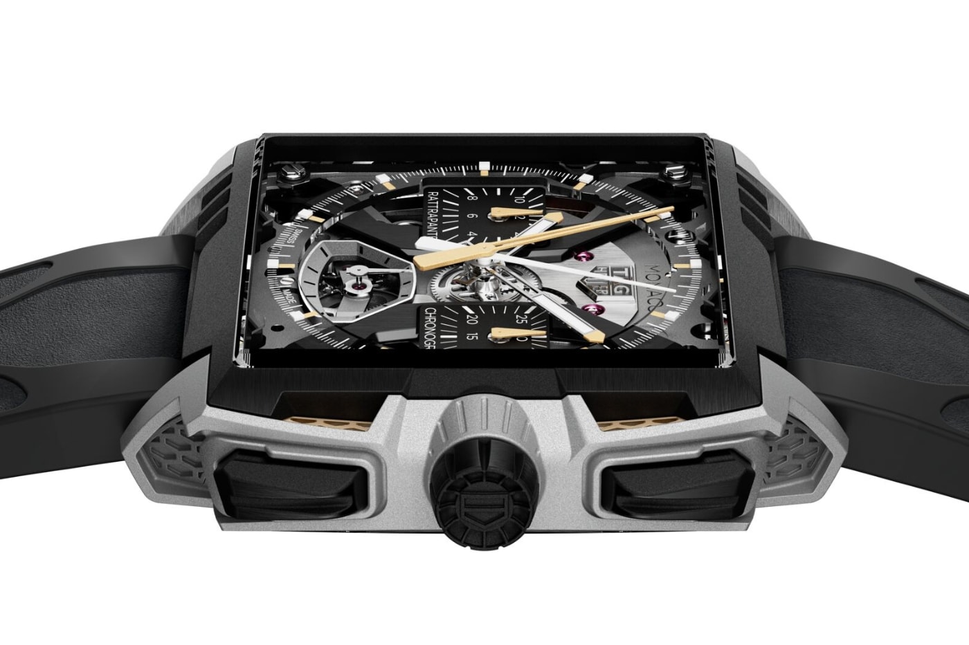 Чорне DLC-покриття безелю підкреслює агресивний профіль, а сапфірові кристали з обох боків розкривають найскладніший механізм усередині. Золоті стрілки хронографа, маркери та кнопка split-seconds на 9 годин, виконана з жовтого золота на честь класичної корони Monaco, завершують сміливий дизайн. І при цьому вага моделі всього 85 грамів – рекордне співвідношення легкості та продуктивності.