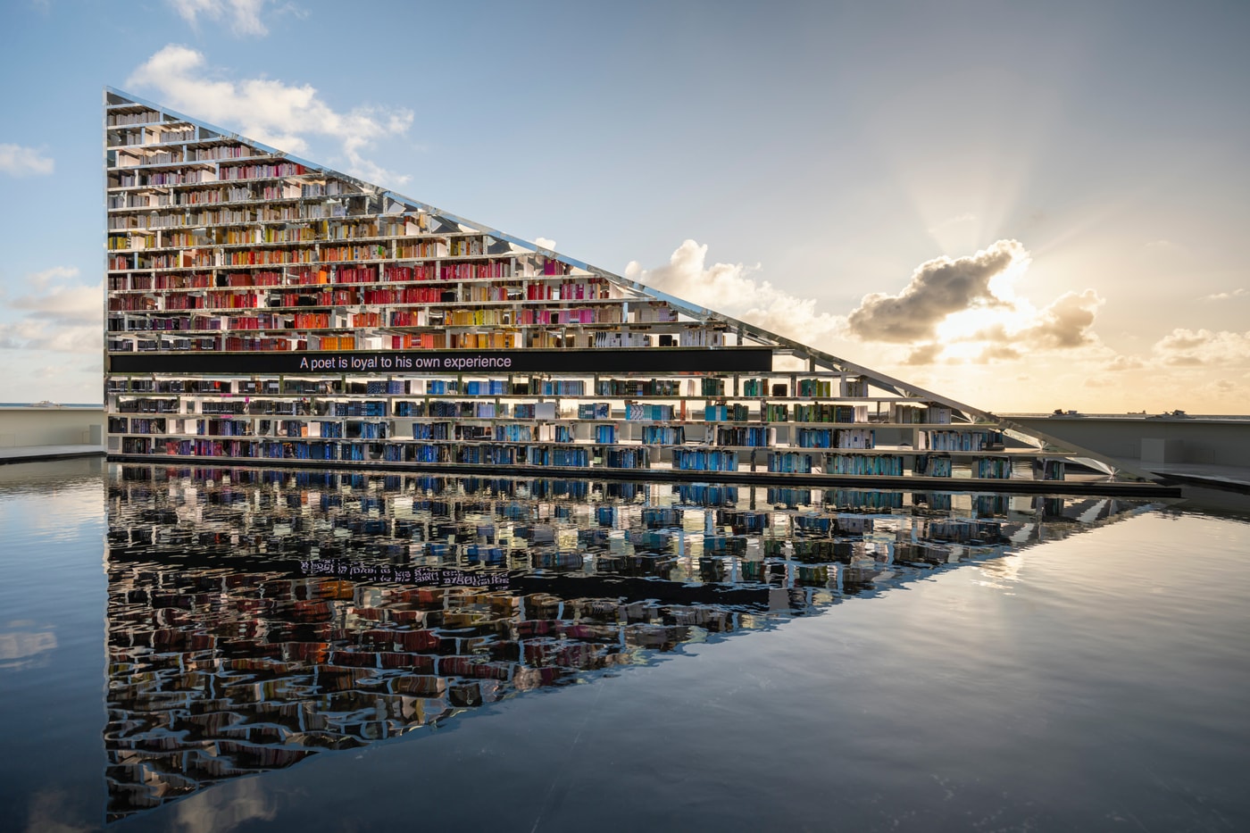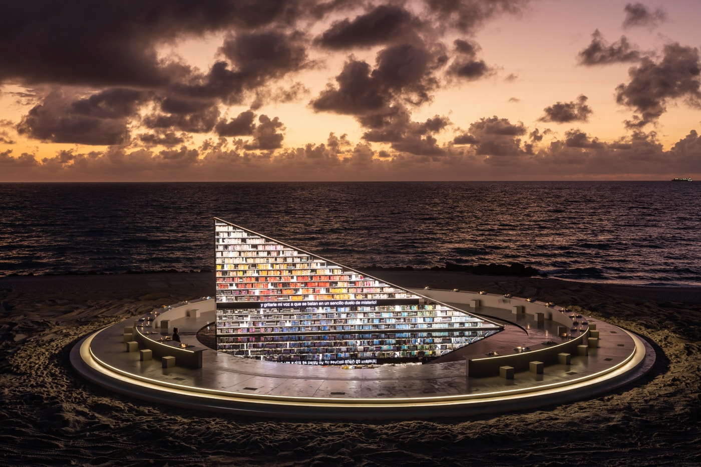 Інсталяція завдовжки 50 футів вміщує 2 500 книг, перетворюючи пляж на справжній літературний оазис. Кожні 10 хвилин бібліотека обертається на металевому п'єдесталі, а світлодіодна смуга завдовжки 34 фути висвітлює простір і відображається у воді, створюючи ефект живого, постійно мінливого полотна.
