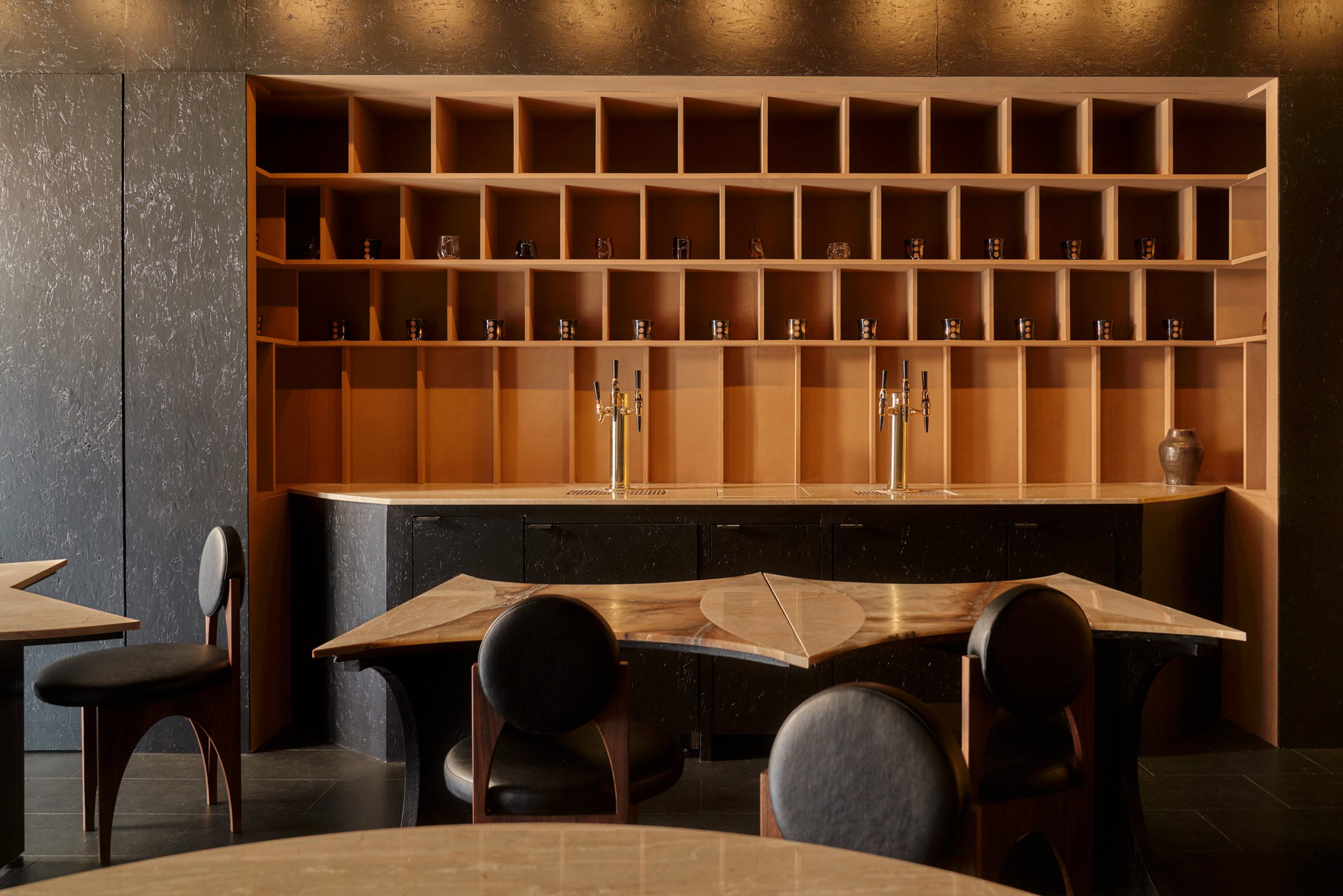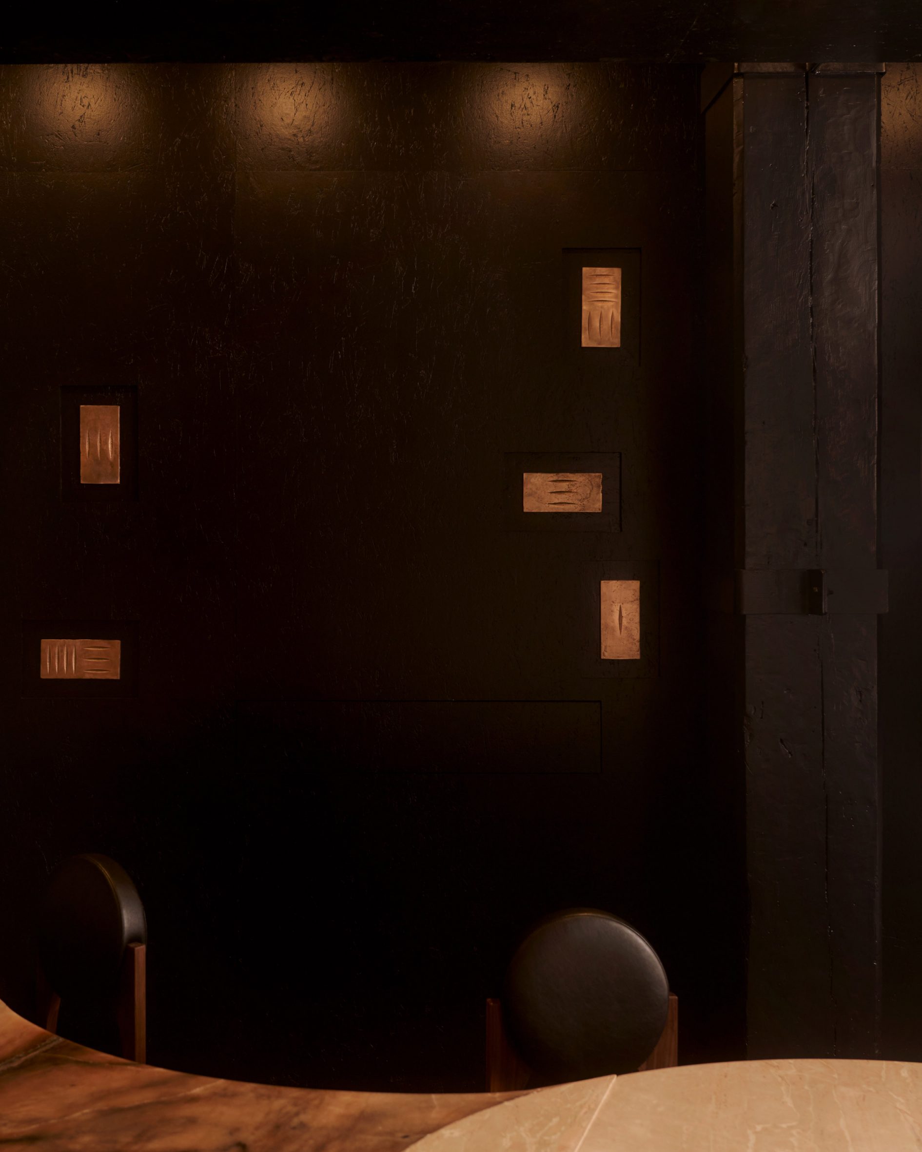 Інтер'єр ресторану вражає складністю шарів та насиченою темною палітрою. Архітектори провели глибоке дослідження історії будівлі ХІХ століття, щоб кожен елемент — від оздоблення стін до розміщення меблів — поєднувався з контекстом South Village Historic District, району з багатою культурною історією.